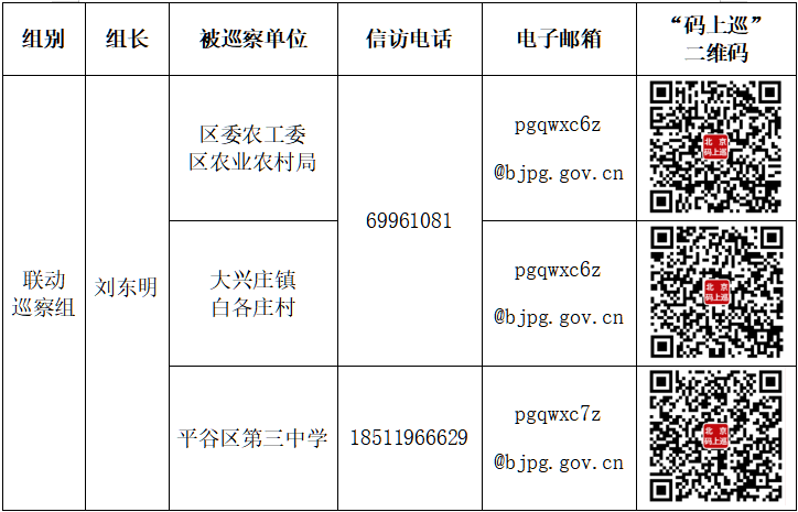 按照市委部署,经区委批准,2025年10月20日至2025年12月12日,平谷区委巡察组对区委农工委区农业农村局、大兴庄镇白各庄村、平谷区第三中学3个党组织开展联动巡察。